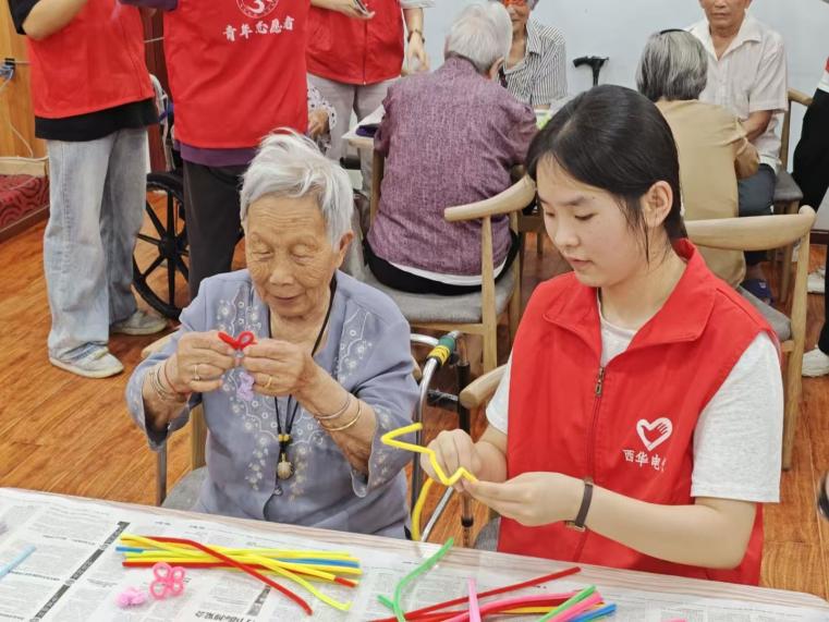 电气学院志愿者们全部到达青孝颐养中心后,表演了《感恩的人》舞蹈,之后合唱了《明天会更好》歌曲节目。随后志愿者们用自带的各色扭扭棒与老人们一同完成许多手工作品,活动过程中与老人们谈心交流,双向互动地了解心理健康问题,互动缓解老人们的孤独感,同时也在弘扬敬老传统中促进我院同学们的心理健康发展。