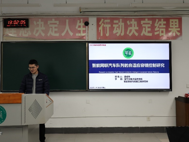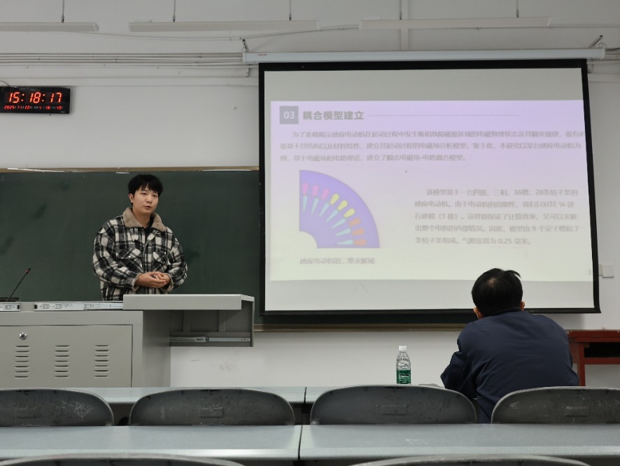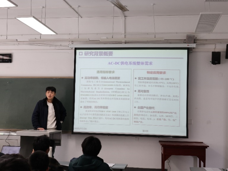 各分会场邀请老师汇报科研前沿内容,易俊宏老师以《全国产高可靠AC-DC电源模块技术研究》为题,深入阐述了国产化电源模块在电力电子系统中的核心作用;潘成伟老师以《智能网联汽车队列的自适应容错控制研究》的报告,引导研究生树立问题导向,专注科研、勤于思考,致力于解决实际问题并创造实际价值;毕雪老师系统阐述了团队在核磁共振成像重建算法上的重要突破:针对高度欠采样条件,创新性地实现了幅度与相位信息的同步高精度联合重建,有效解决了传统方法中相位恢复不稳定、伪影积累及表达能力不足等核心难题;高海燕老师以《利用行波散射实现纳米机械振子参数测量方案》为题,展开系统阐述。她的汇报依次围绕背景介绍、经典力学振动的参数测量原理、Qubit-NMR系统测量NNMR的物理参数、TLR-Qubit-NRM系统测量NMR的物理参数,以及添加谐振器前后的精度对比这五个部分展开,清晰呈现了从理论基础到创新方案再到性能验证的完整研究脉络,为纳米机械振子参数测量提供了新思路,引发在场师生的热烈关注;董志鸿老师以《新型城市轨道交通微电网规划与控制优化研究》为题作专题报告。他指出,面向城市轨道交通绿色化与高效化发展需求,构建适配负荷特性的新型微电网成为关键。