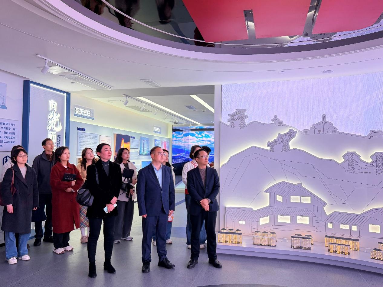 会谈前,老师们前往集团展示大厅,了解了四川水电集团的发展历程、电网建设、未来规划等,包括农网改造、完善和升级工程等,以及集团的党建引领群团等情况。